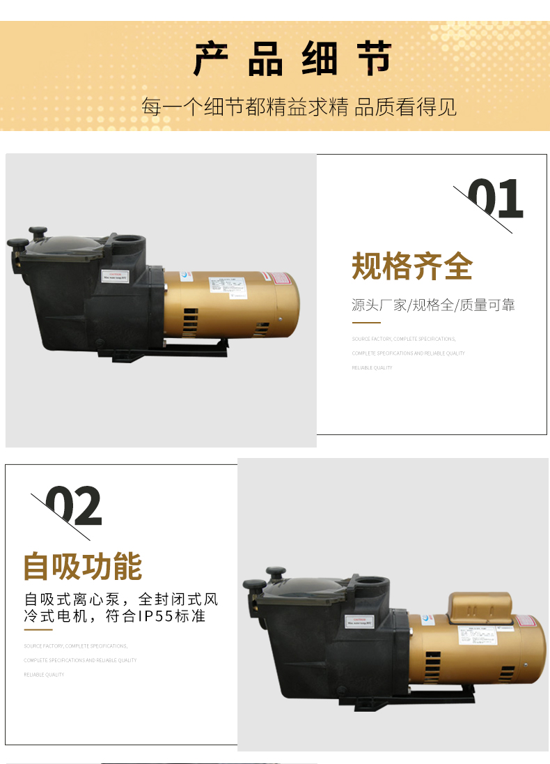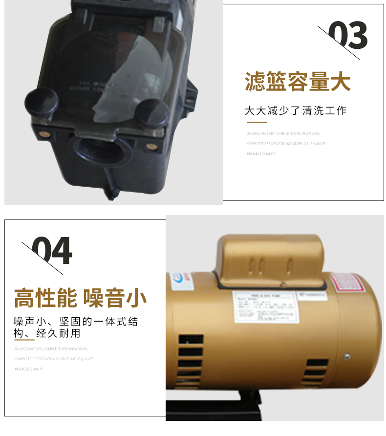 根據水力學原理設計的泵體,泵體、葉輪采用高強度工程塑料,經久耐用。濾藍容量大,大大減少了清洗工作。性能好,效率高,加快了注水(灌溉)速度并提高了能源效率。適用于各種泳池、工業用水、海洋館、水上樂園等。