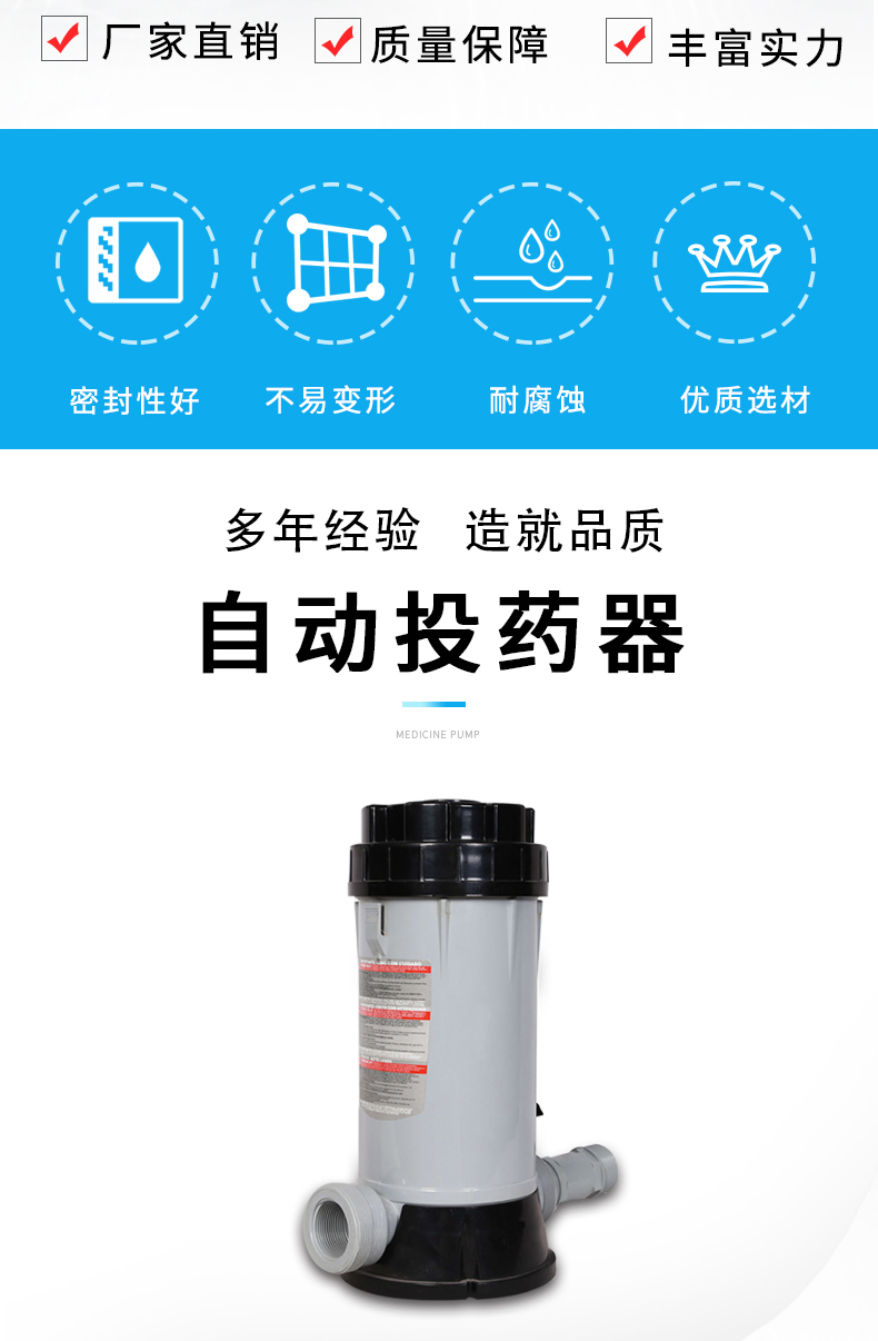 泳池藥物投加裝置,效率高,無須人工管理,控制安全可靠,節省人力,操作方便,省時省力。